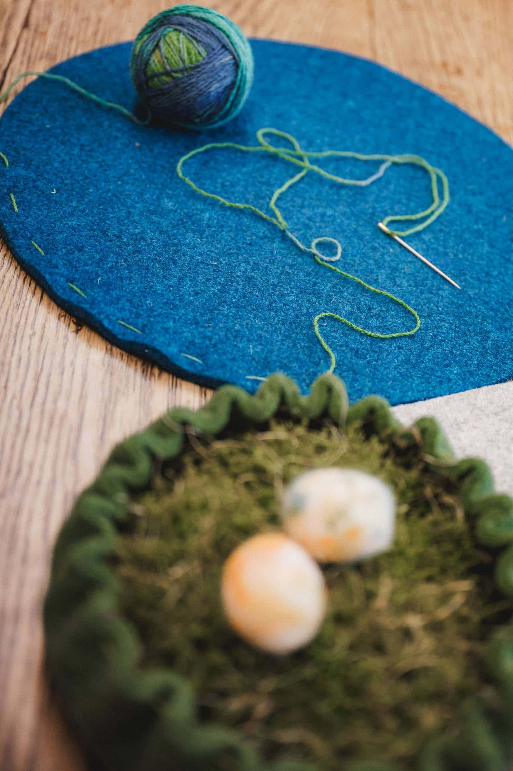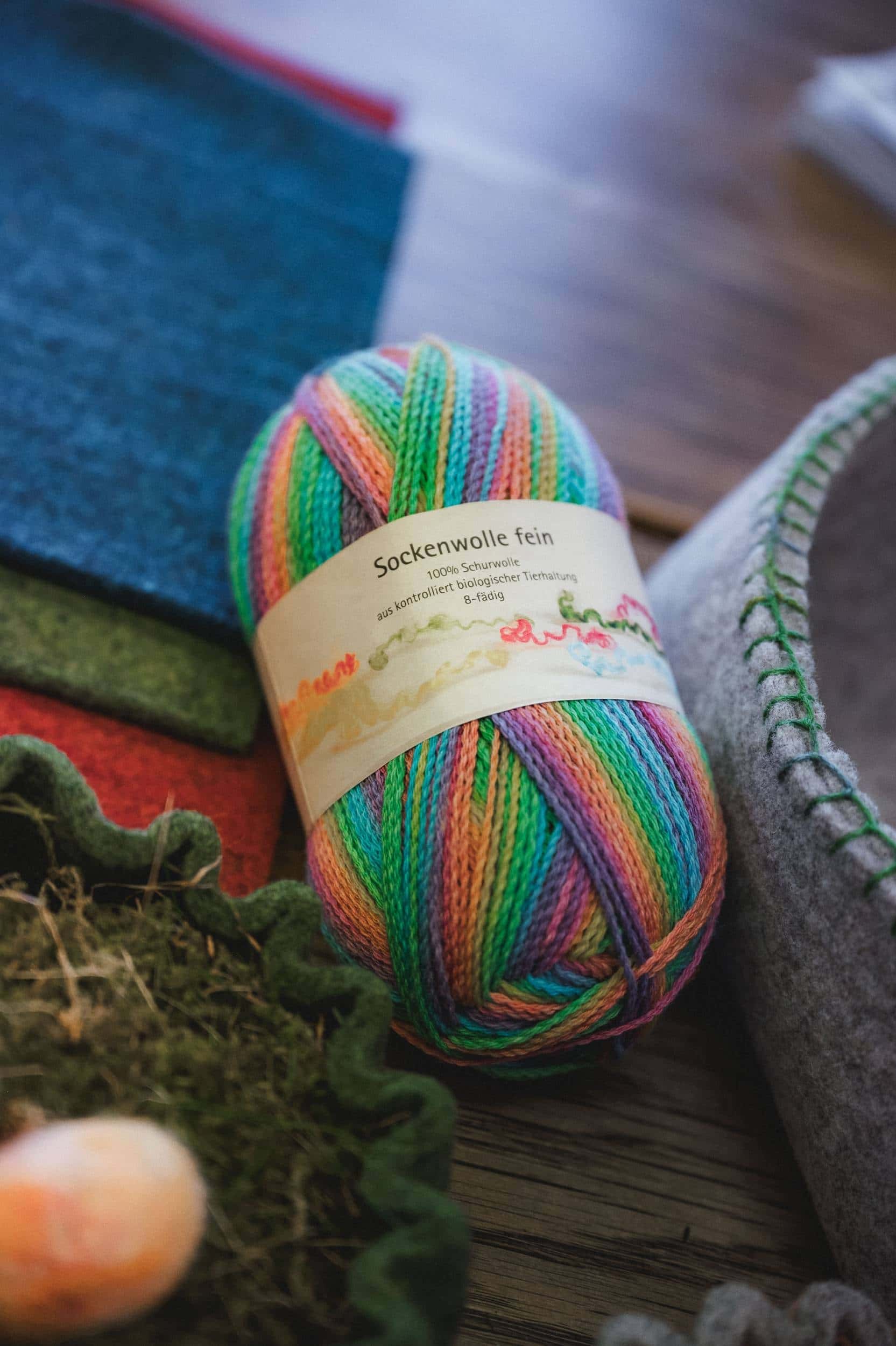 • Finkhof-Nadelfilz in beliebiger Farbe• Feine Sockenwolle mit Farbverlauf als Nähgarn