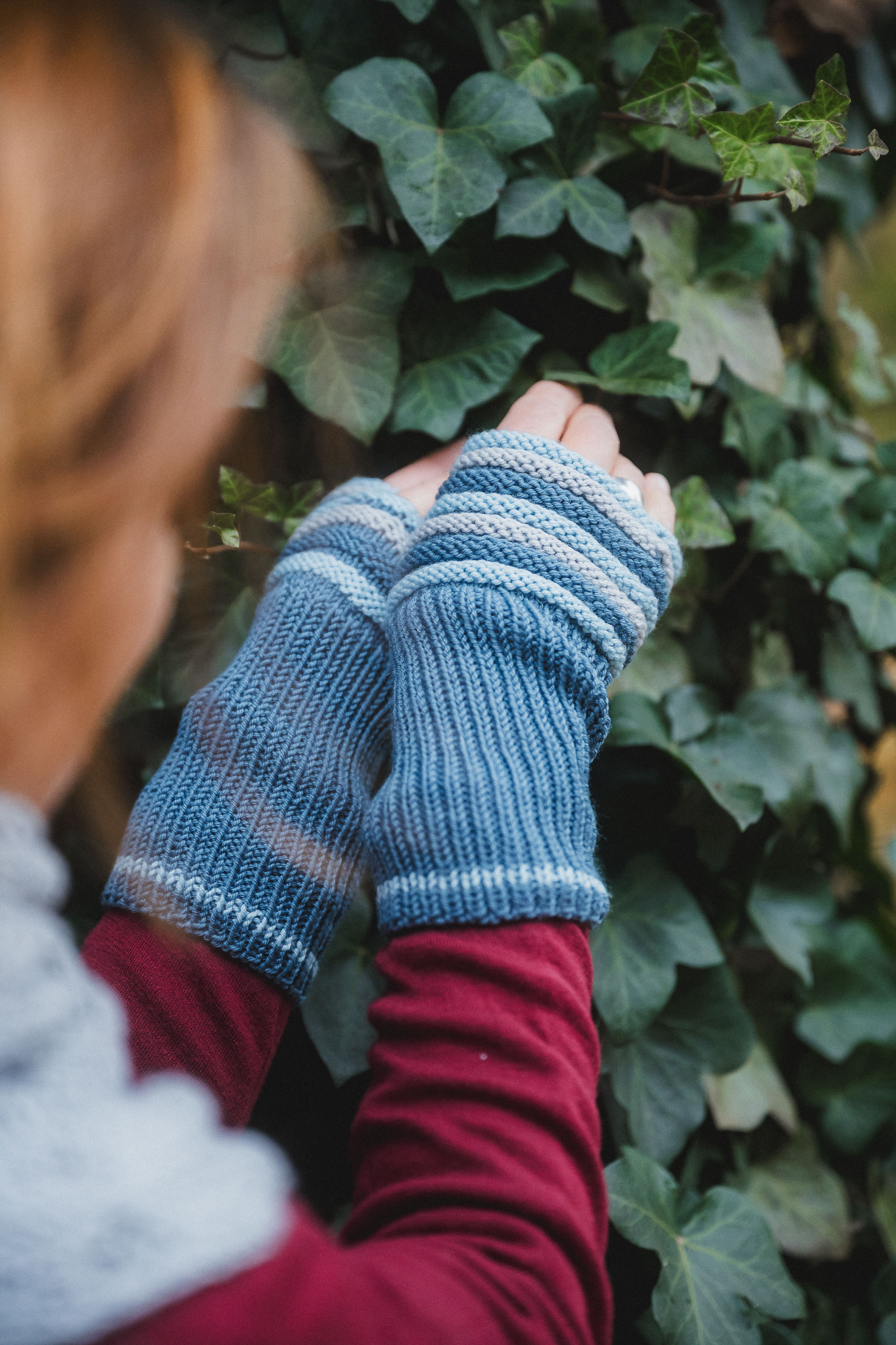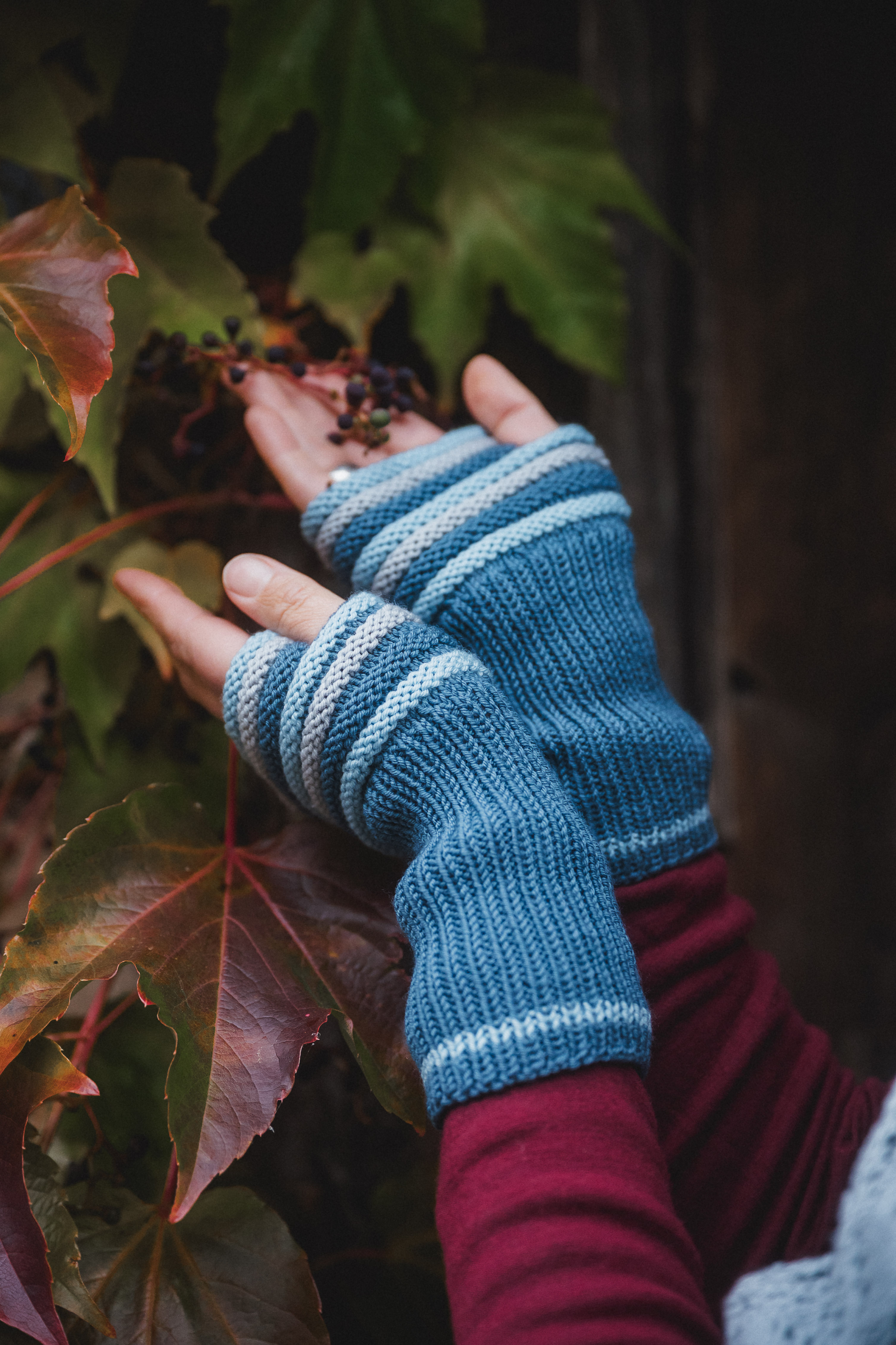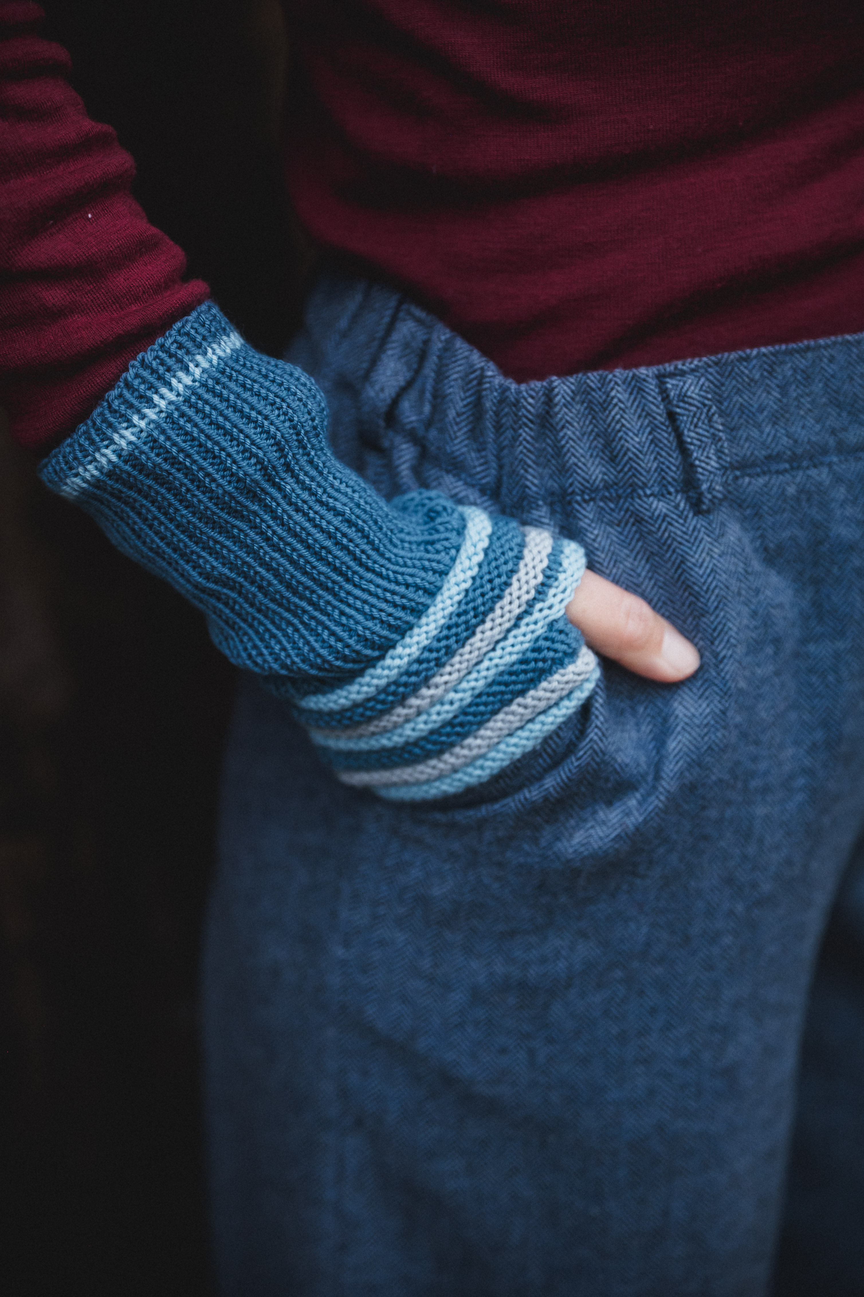 - 2 Reihen in hellblau stricken, dann weiter in rauchblau, bis das Bündchen ca. 13 cm lang ist