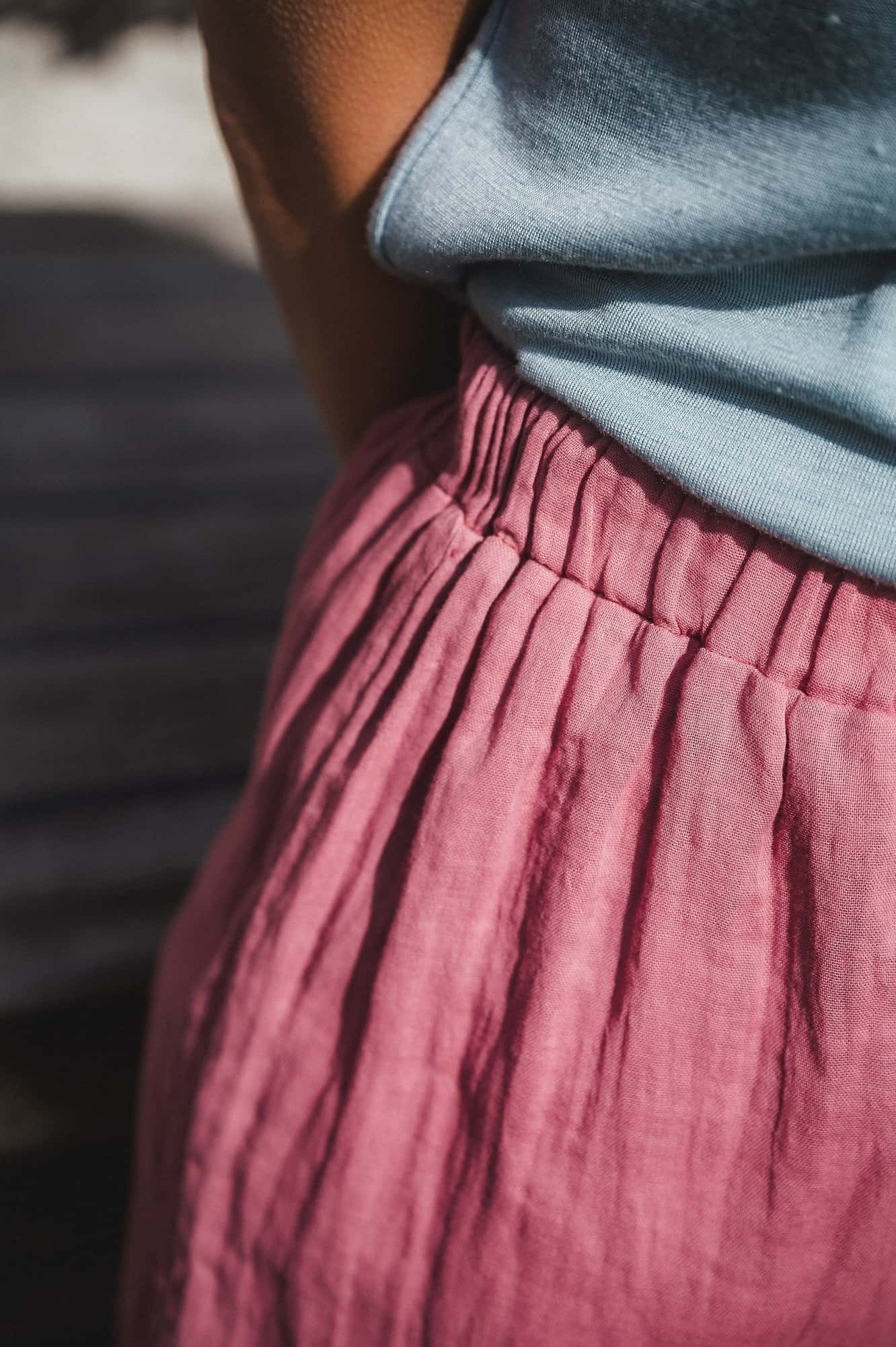 Unsere Damenshorts aus leichtem Musselinstoff aus 100 % Bio-Baumwolle ist die perfekte kurze Hose für heiße Sommertage. Sie wird in Handarbeit in unserer hauseigenen Stoffnäherei gefertigt. Der Baumwollstoff ist schön luftdurchlässig und fühlt sich angenehm leicht auf der Haut an. Für einen bequemen Sitz ist die Baumwollhose mit einem elastischen Gummiband versehen und weit geschnitten.