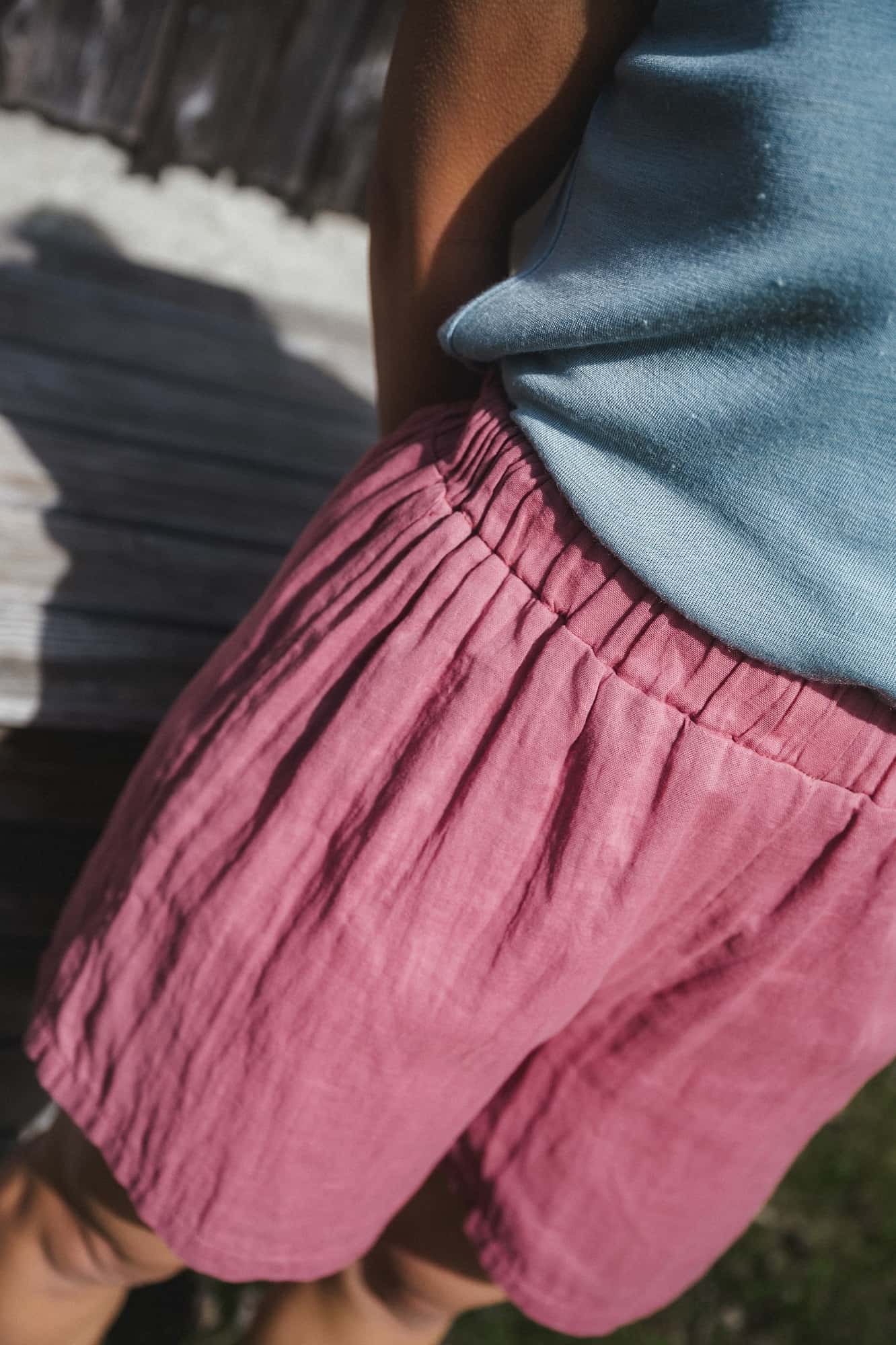 Damenshorts aus Bio-Baumwoll-Musselin ist, sofern auf Lager, in den Größen S, M und L erhältlich.