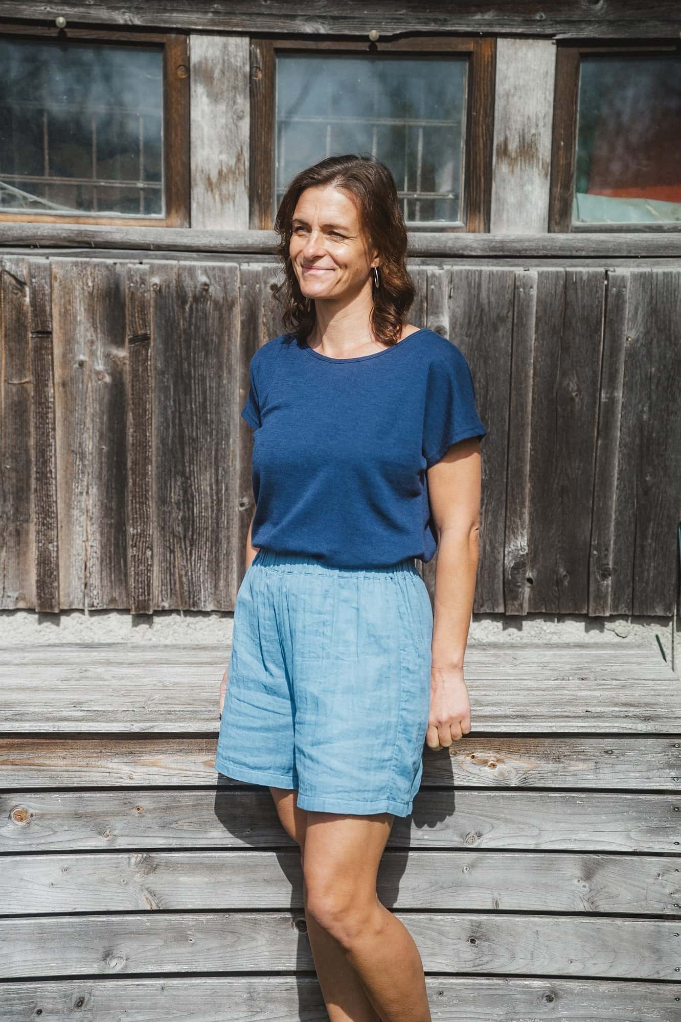 Unsere Damenshorts aus leichtem Musselinstoff aus 100 % Bio-Baumwolle ist die perfekte kurze Hose für heiße Sommertage. Sie wird in Handarbeit in unserer hauseigenen Stoffnäherei gefertigt. Der Baumwollstoff ist schön luftdurchlässig und fühlt sich angenehm leicht auf der Haut an. Für einen bequemen Sitz ist die Baumwollhose mit einem elastischen Gummiband versehen und weit geschnitten.