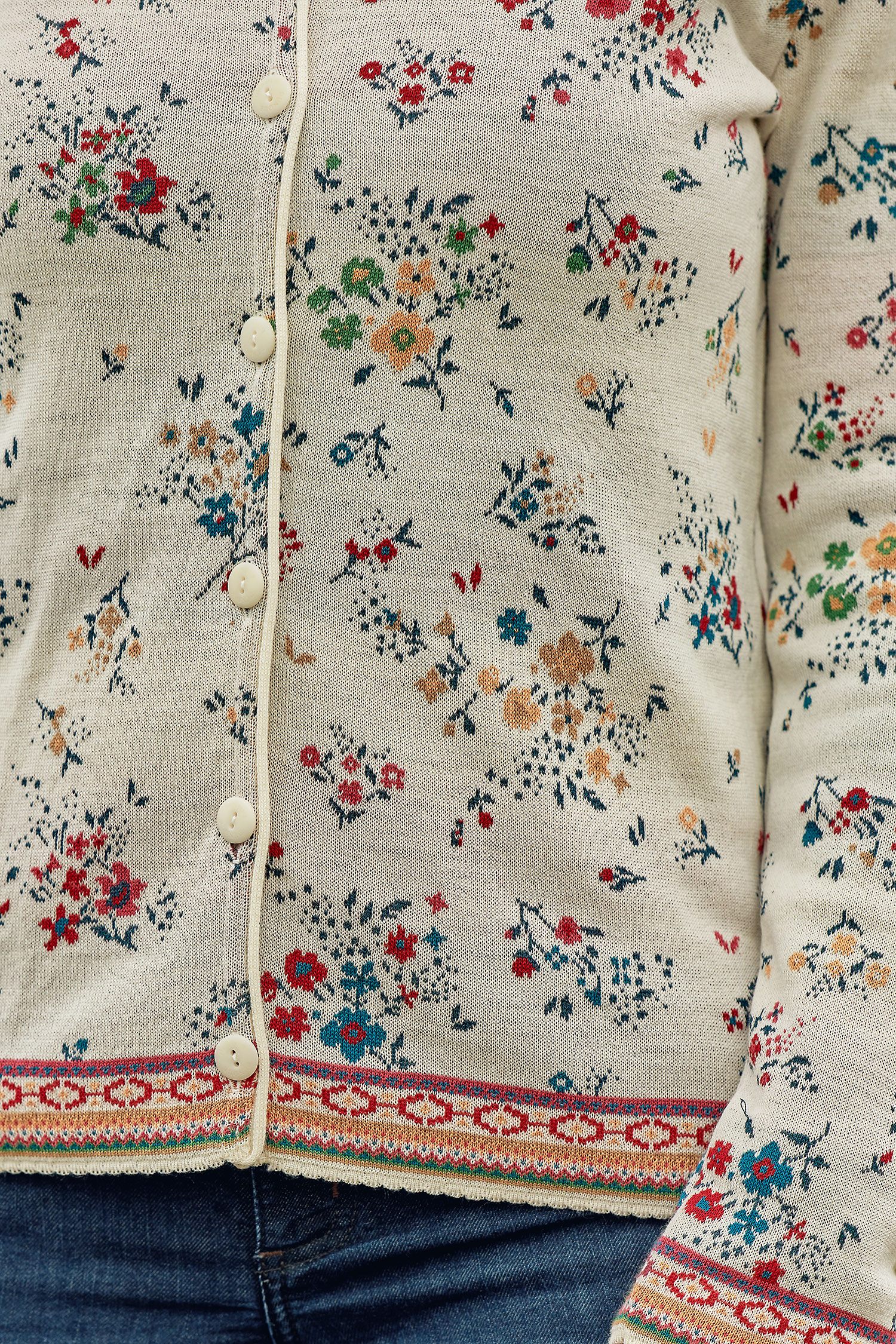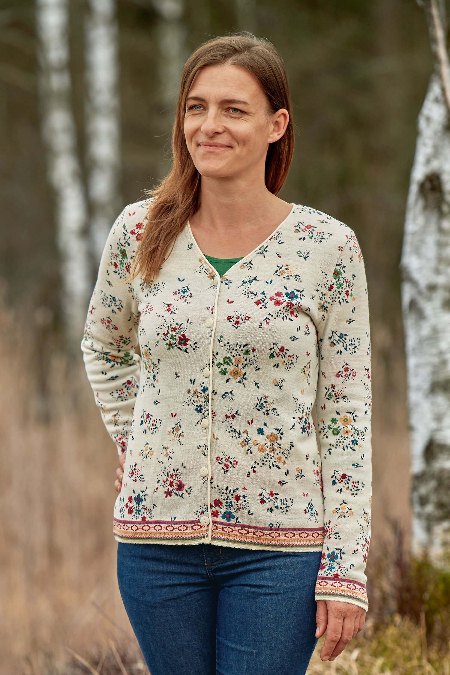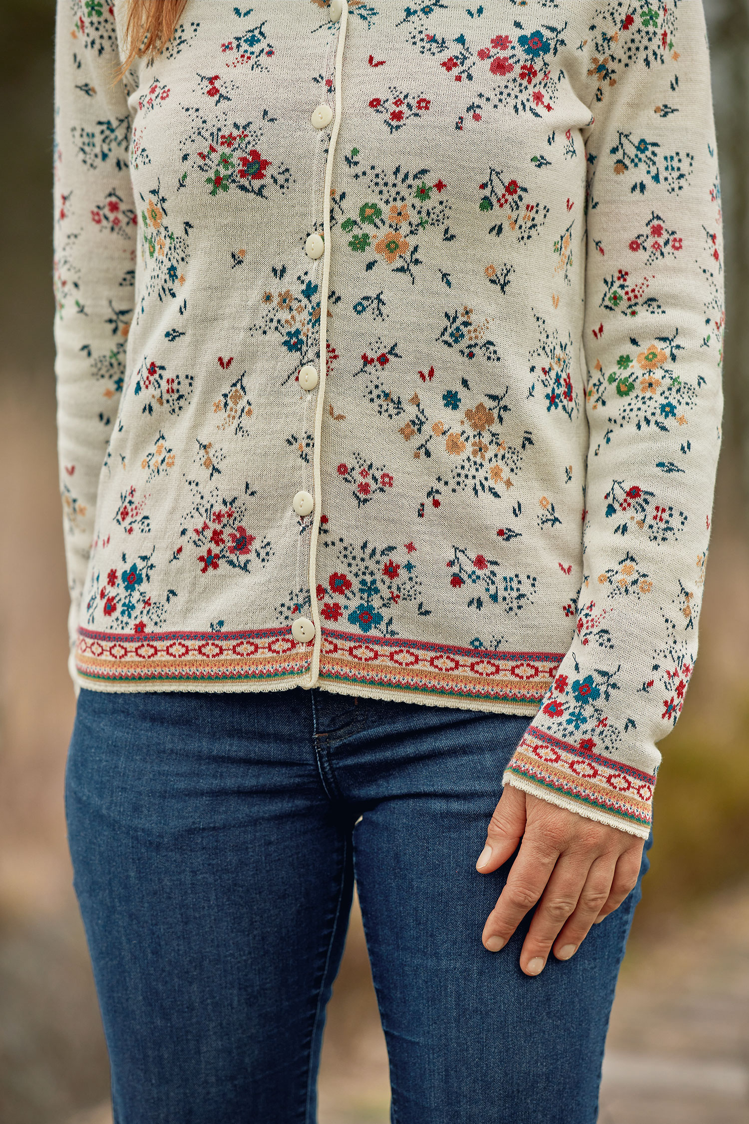 Dieses feine Strickjäckchen aus 70 % besonders weicher Bio-Merinowolle und 30 % Bio-Baumwolle ist wunderbar leicht und dennoch wärmend. Durch das hautsympathische Wolle-Baumwolle-Gemisch trägt es sich zu jeder Jahreszeit sehr angenehm. Die Damen-Strickjacke mit dem zarten Blütenmuster auf dem leuchtend roten Grund und den hübschen Zierborten an Ärmelabschlüssen und Saum lässt sich leicht kombinieren - findet sich doch ein farblich passendes Oberteil und eine Jeans in jedem Kleiderschrank. Der Cardigan ist mit einer farblich abgestimmten Knopfleiste versehen.