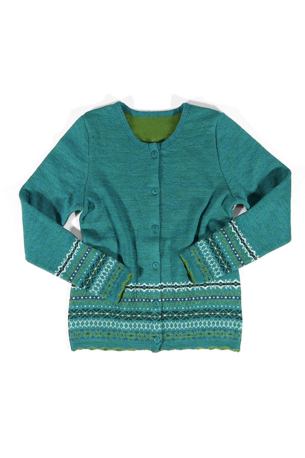 Wir haben unser beliebtes Strickmuster "Nordic" aufgegriffen und bei dieser Strickjacke mit schönen Bordüren umgesetzt. Armabschlüsse und Saum zieren zudem eine feine Wellenkante. Die klassisch geschnittene Strickjacke aus 100 % Schurwolle aus kontrolliert biologischer Tierhaltung (kbT) wird mit farblich passenden Knöpfen aus Steinnuss gechlossen.