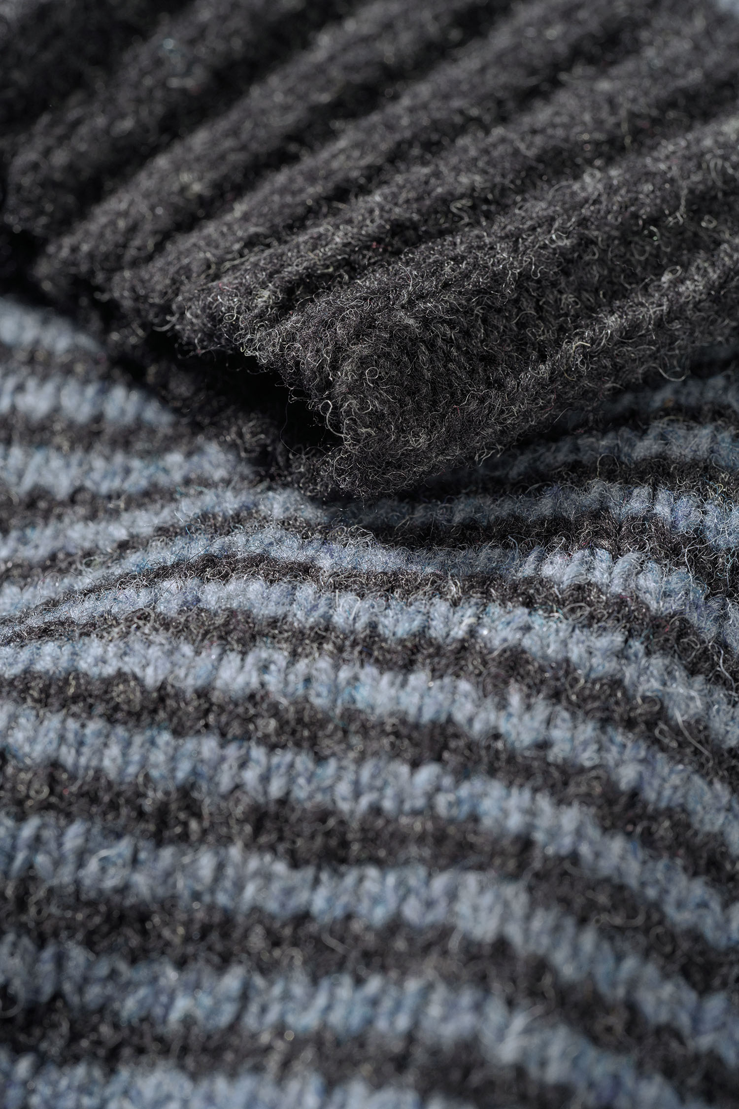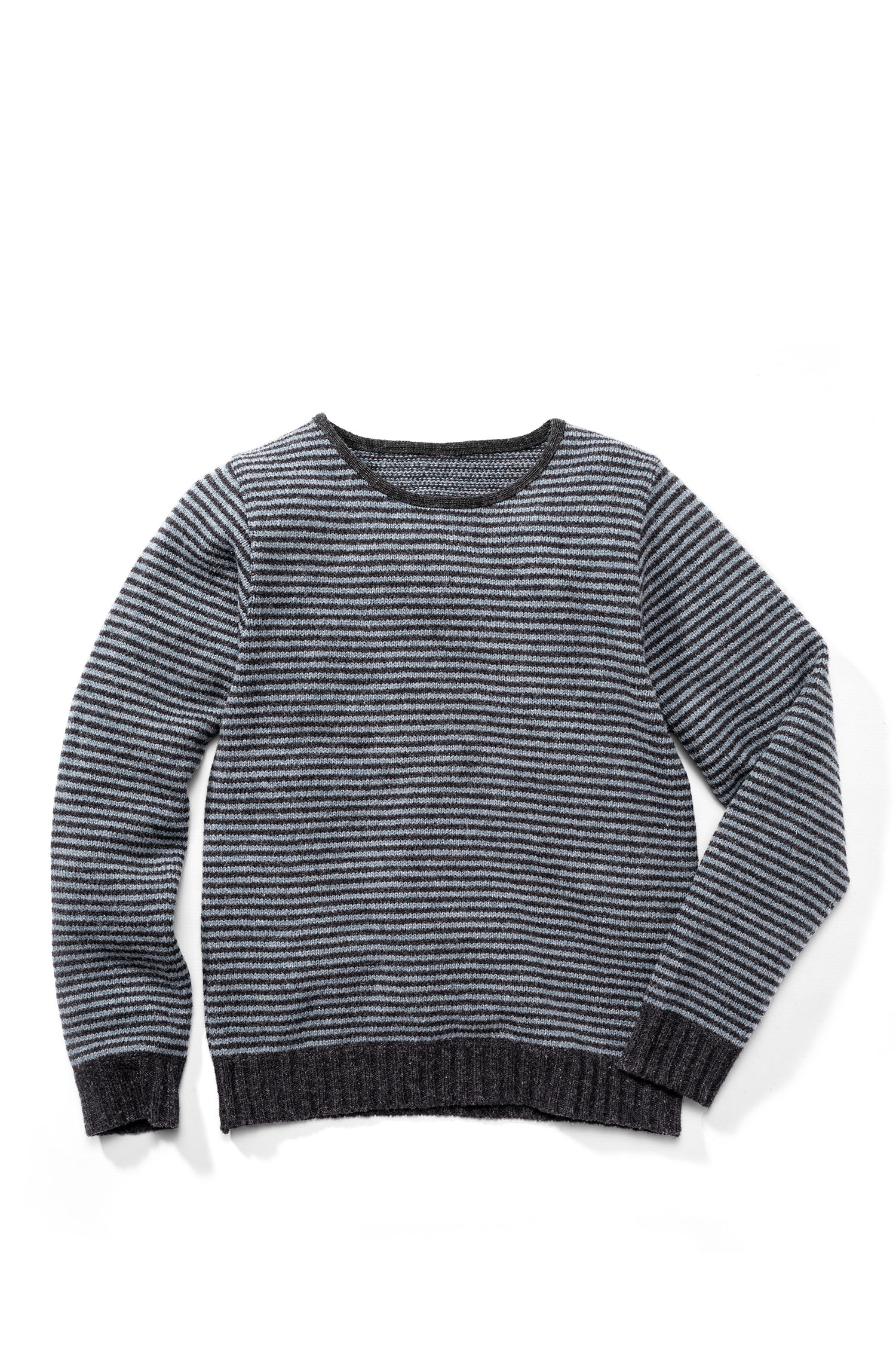 Klassisch geschnittener Rundhalspullover für Damen und Herren mit lässigen Streifen in Anthrazit und Rauchblau. Der gemütliche unisex Pullover wird aus 100 % Bio-Schurwolle vom Merinolandschaf regional auf der Schwäbischen Alb für uns gefertigt. Ein wunderbar alltagstauglicher Wollpullover für Mann und Frau mit Potential zum neuen Lieblingsstück!