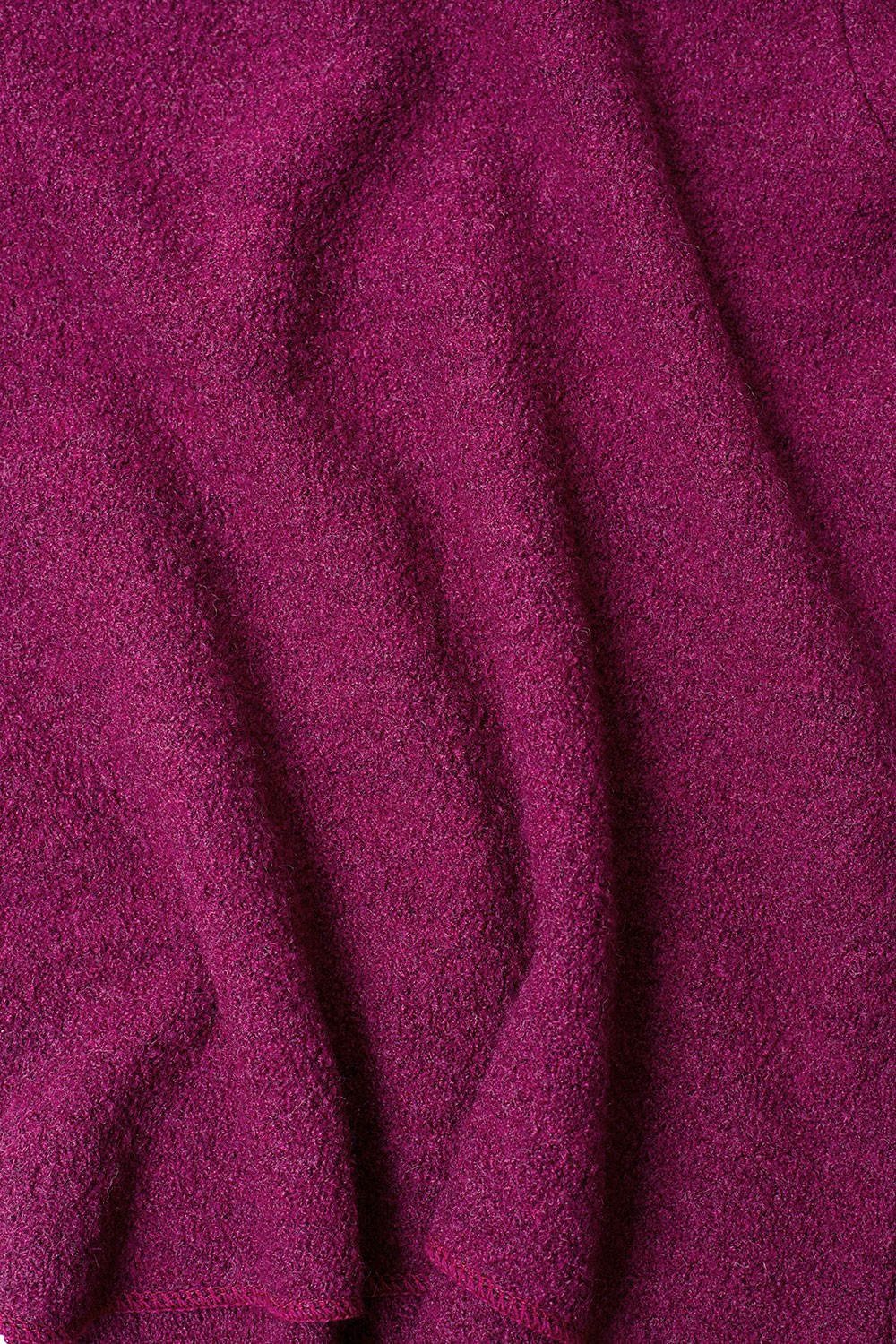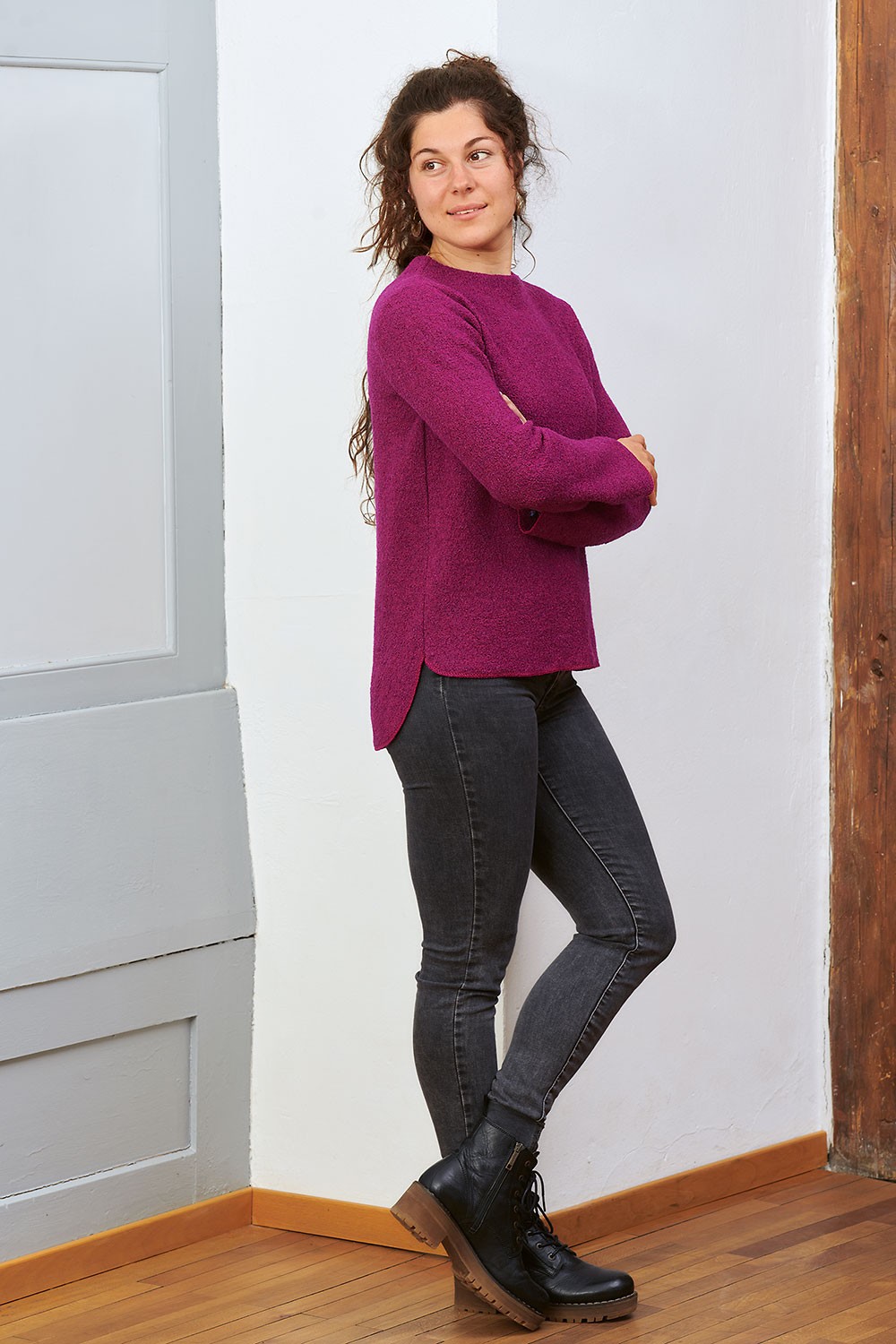 Ein raffiniert geschnittener femininer Pullover aus 100 % Schurwolle aus kontrolliert biologischer Tierhaltung (kbT). Er hat ein verlängertes Rückenteil sowie einen kleinen Stehkragen. Durch leichtes Walken des Gestricks entsteht ein dehnbarer, unempfindlicher Stoff mit einer fein strukturierten, leicht gekräuselten Oberfläche. Genau das richtige Material für einen gemütlichen, warmen Lieblingspullover mit einer besonderen Note. Der kräftige, warme Fuchsiaton harmoniert sowohl mit hellem als auch dunklem Haar.
