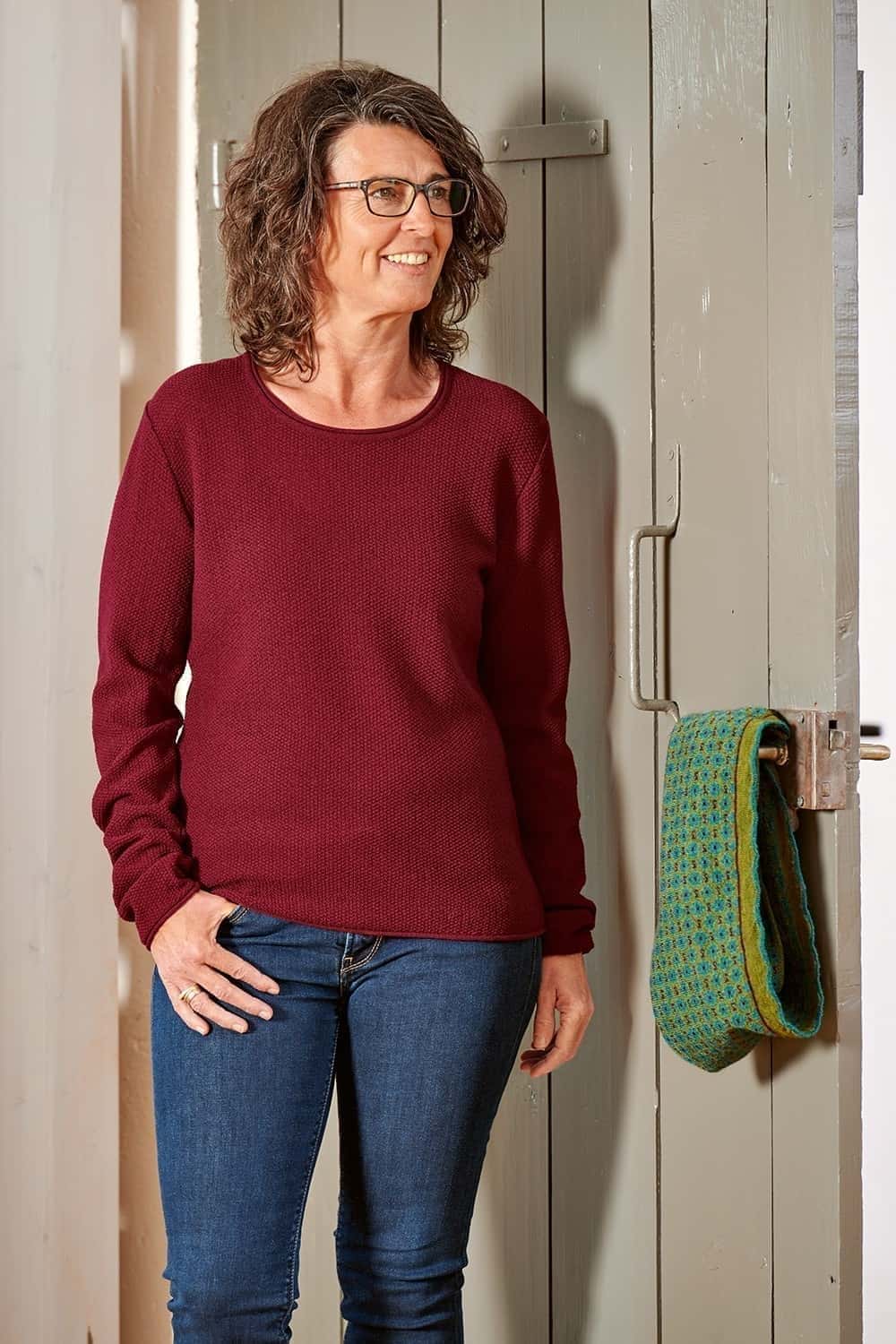 Dies ist eine weitere Variante unseres beliebten Klassikers, dem Wollshirt. Auch hier wird reine Schurwolle aus kontrolliert biologischer Tierhaltung (kbT) zu einem leichten Pullover mit femininem Rundhalsausschnitt verarbeitet. Das bordeauxrote Garn wird in diesem Fall so verstrickt, dass eine körnige, lebendige Struktur entsteht. Zusätzlich sind Saum, Bündchen und Halsausschnitt jeweils mit einem modischen Rollrand versehen.