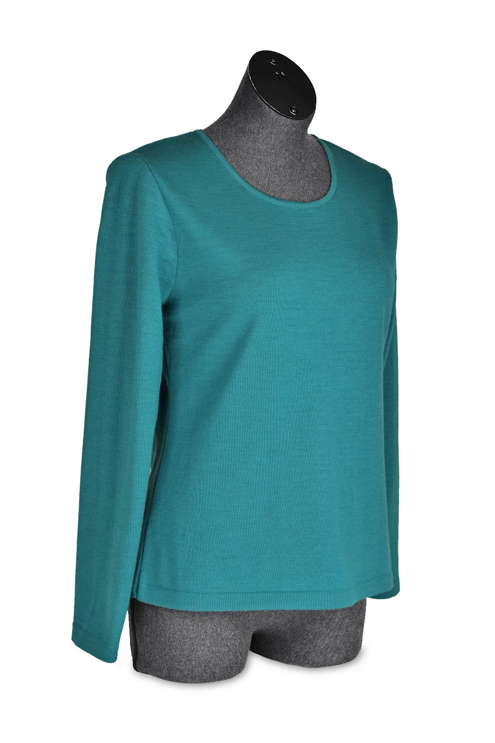 Feine Schurwolle aus kontrolliert biologischer Tierhaltung (kbT), kombiniert mit einer schnörkellosen Form, ergibt diesen herrlich leichten Pullover. Mit seiner glatten Strickart, dem femininen Halsausschnitt und den geraden Abschlusskanten erinnert er an ein T-Shirt und lässt sich auch so vielseitig verwenden.
