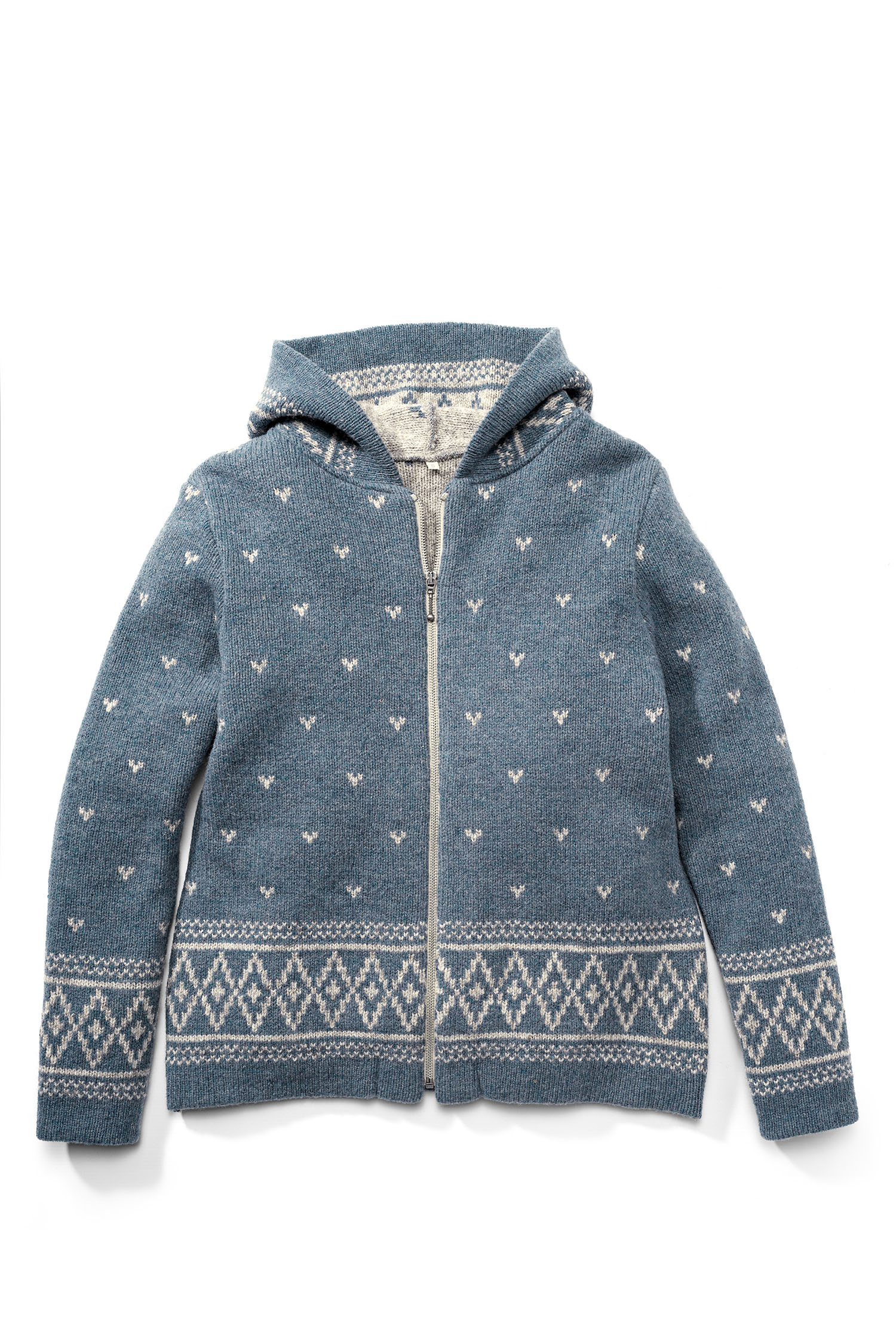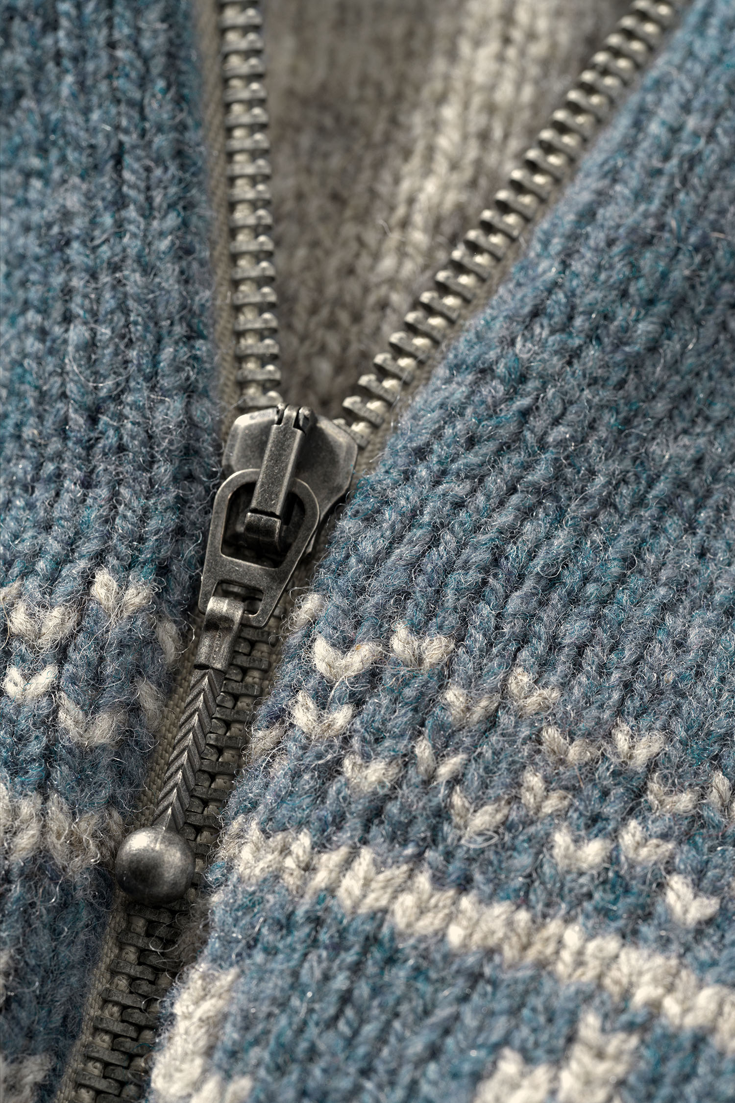 Diese schöne Kapuzenjacke mit klassischem Norweger-Muster wird aus 100 % regionaler Bio-Schurwolle (kbT) gefertigt. Unser neues Rauchblau wird hier mit unserem ungefärbten Garn in Grau kombiniert. Durch die doppelte Strickart ist sie wunderbar warm und dicht.