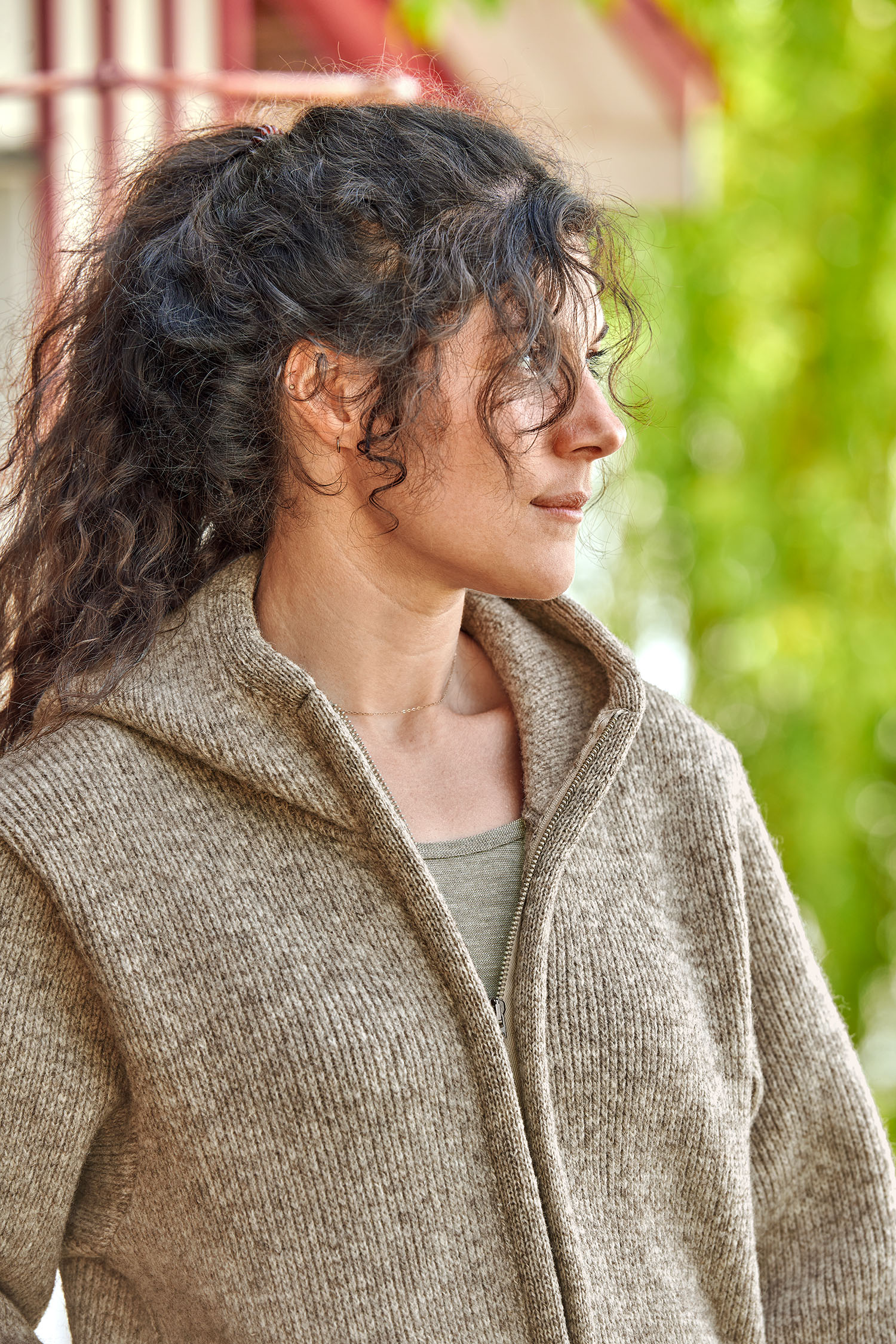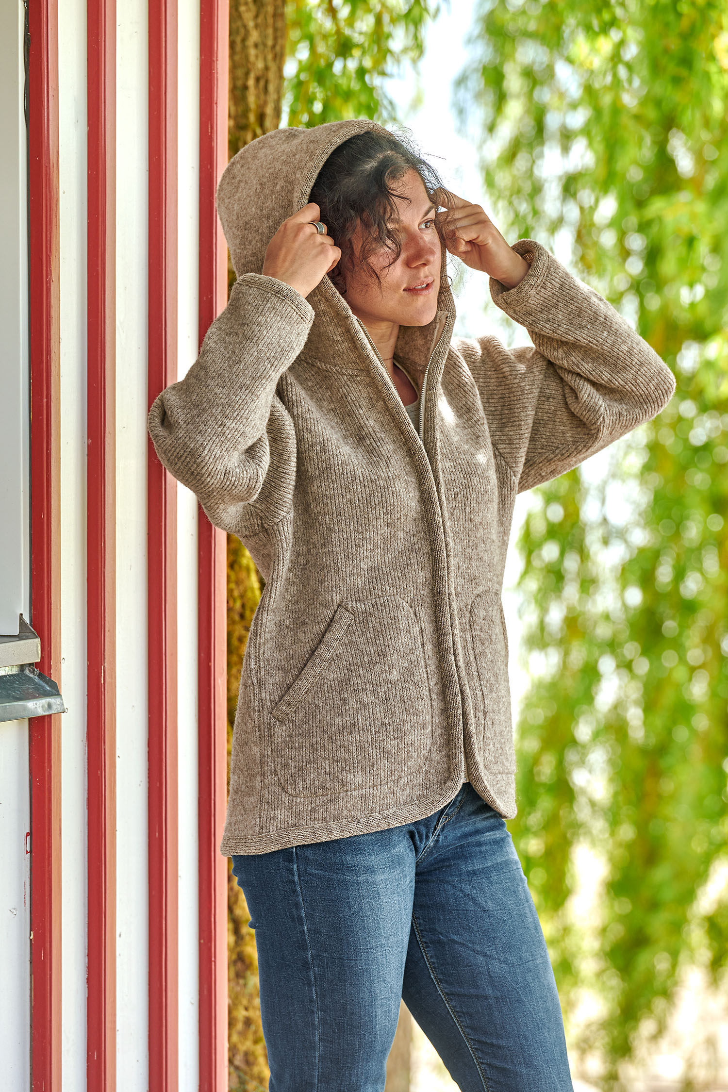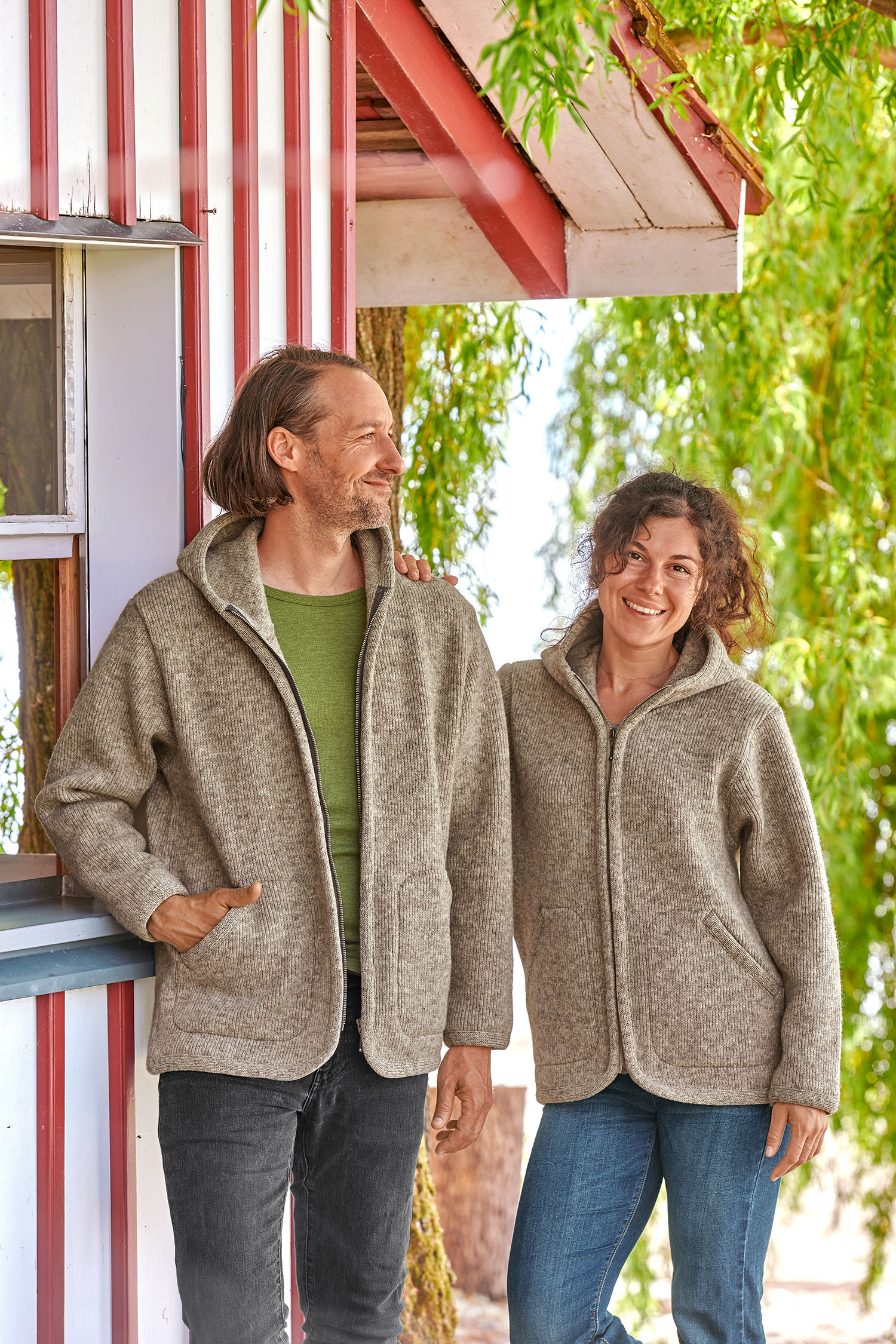 Diese robuste und warme unisex Jacke lassen wir aus 100 % ungefärbter regionaler Bio-Schurwolle (kbT) fertigen. Sie wird leicht gewalkt, wodurch ein unempfindliches, windabweisendes Gestrick entsteht. Die Jacke hat eine praktische Kapuze sowie zwei geräumige, seitlich eingearbeitete Taschen. Die Kanten sind sorgfältig eingefasst und verarbeitet.